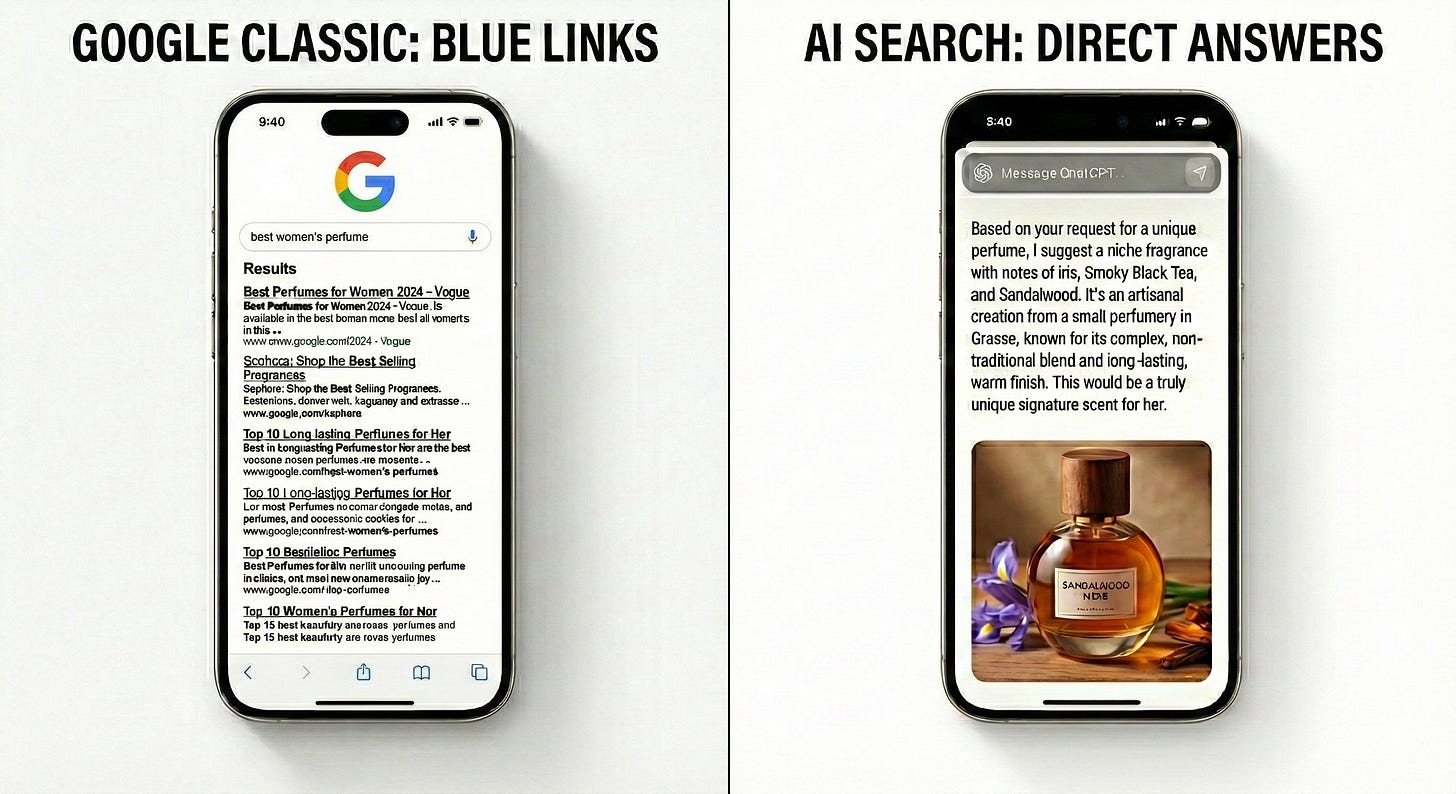 On high‑value intents (“understated weekender bag for Gstaad,” “heritage steel watch,” “quiet luxury jewelry”), the primary interface is now an AI answer: a synthesized recommendation, not a page of results.